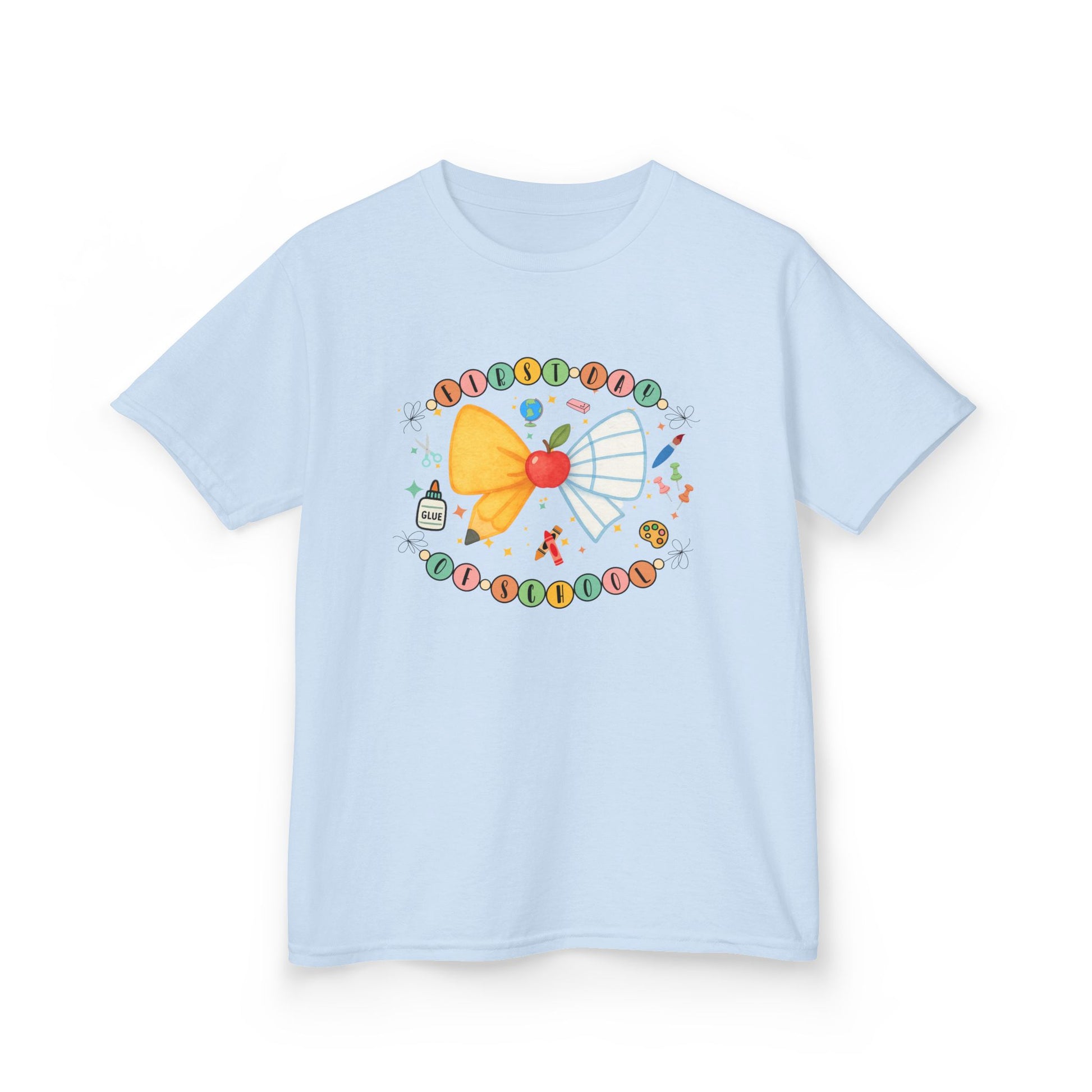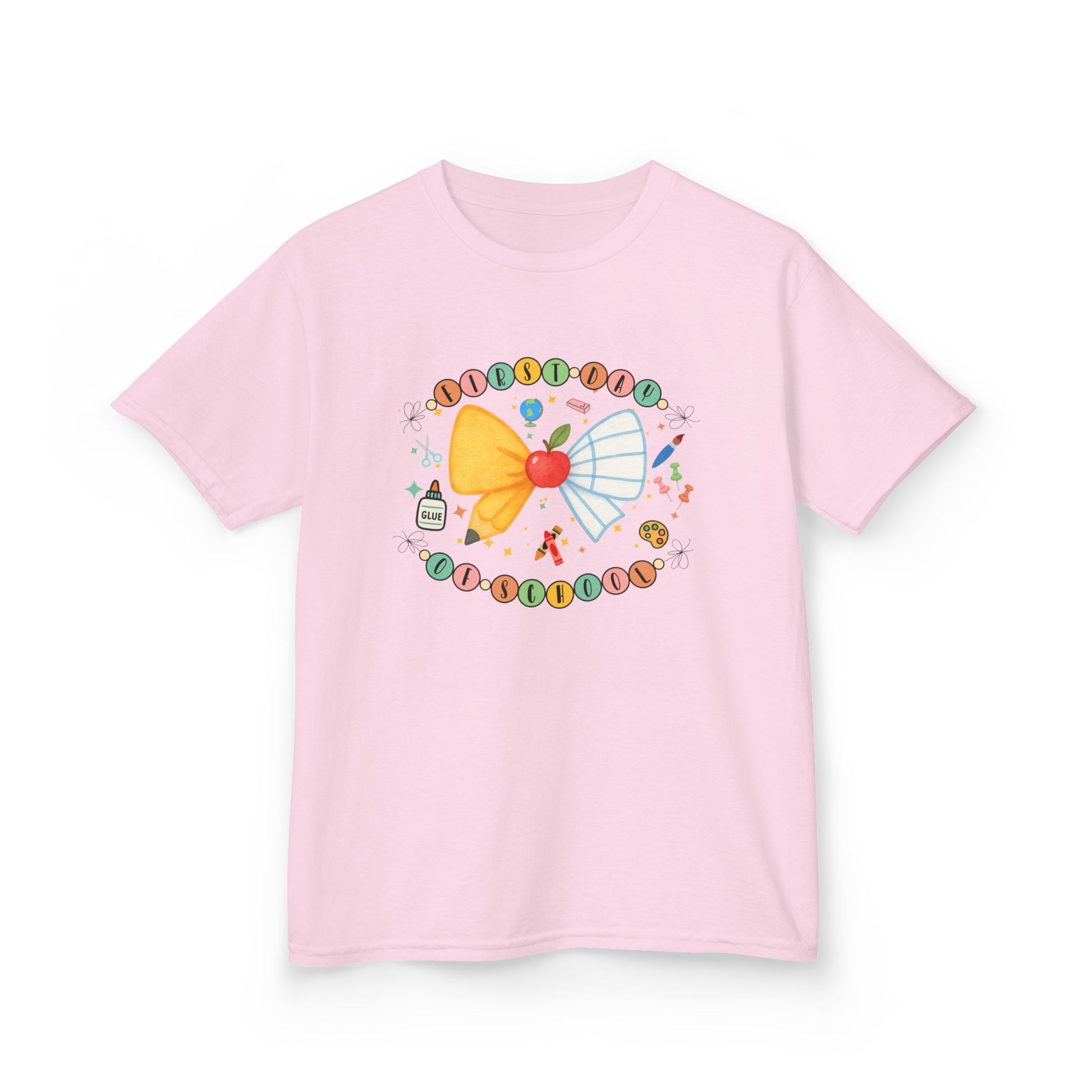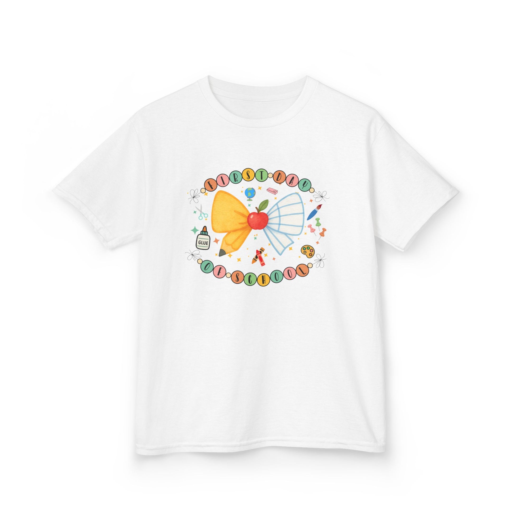 Kick off the school year with this adorable “First Day of School” t-shirt! This playful design features a bright yellow pencil-shaped bow with a red apple center, surrounded by colorful school supplies and a hand-drawn friendship bracelet that spells out “First Day of School.”