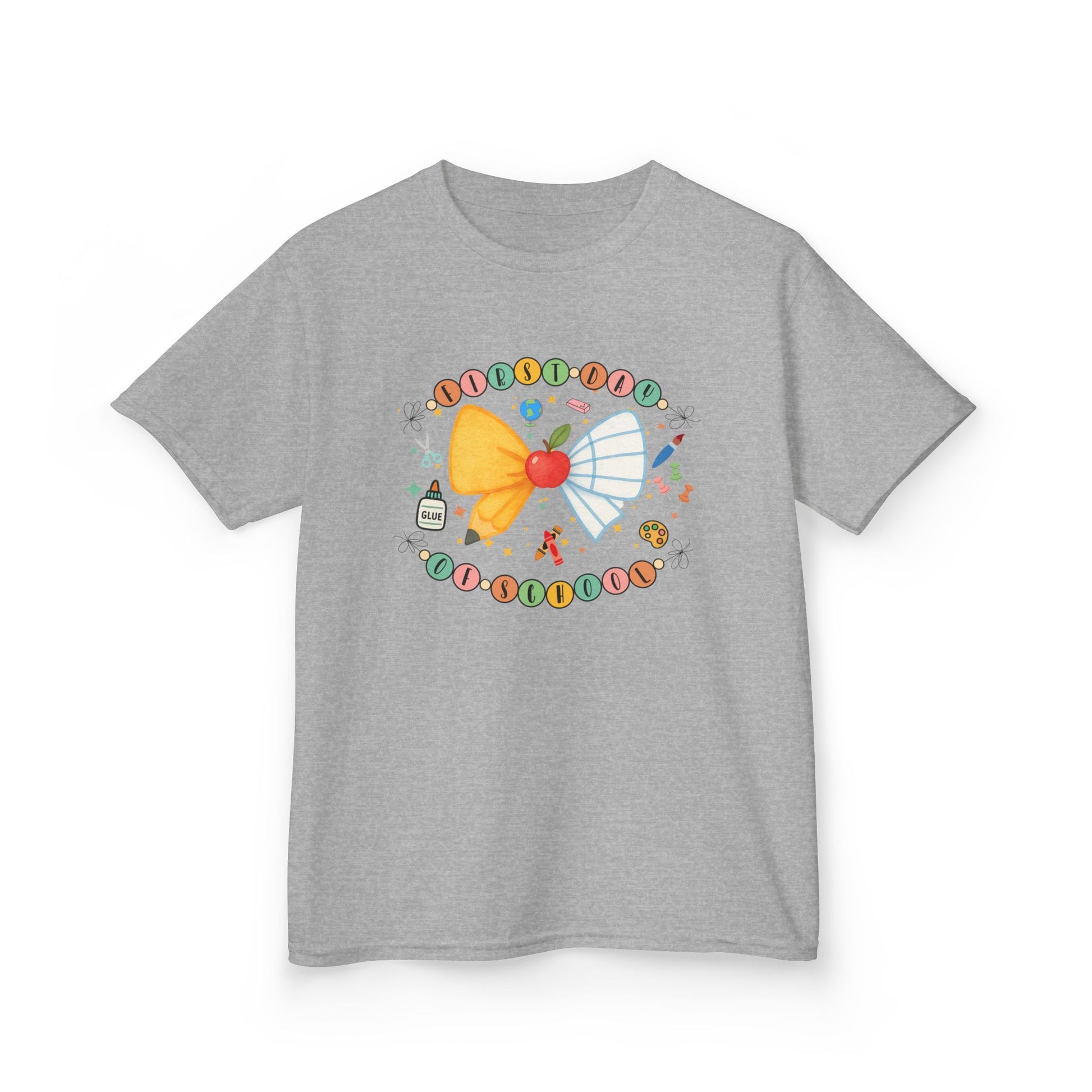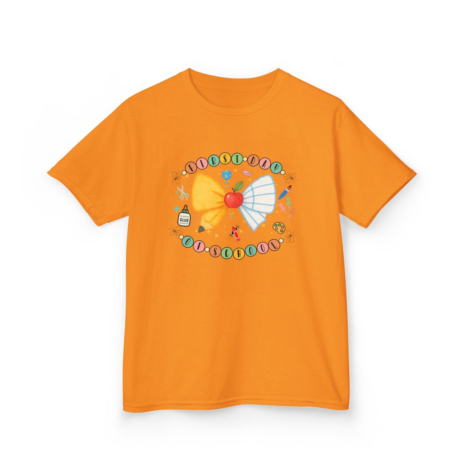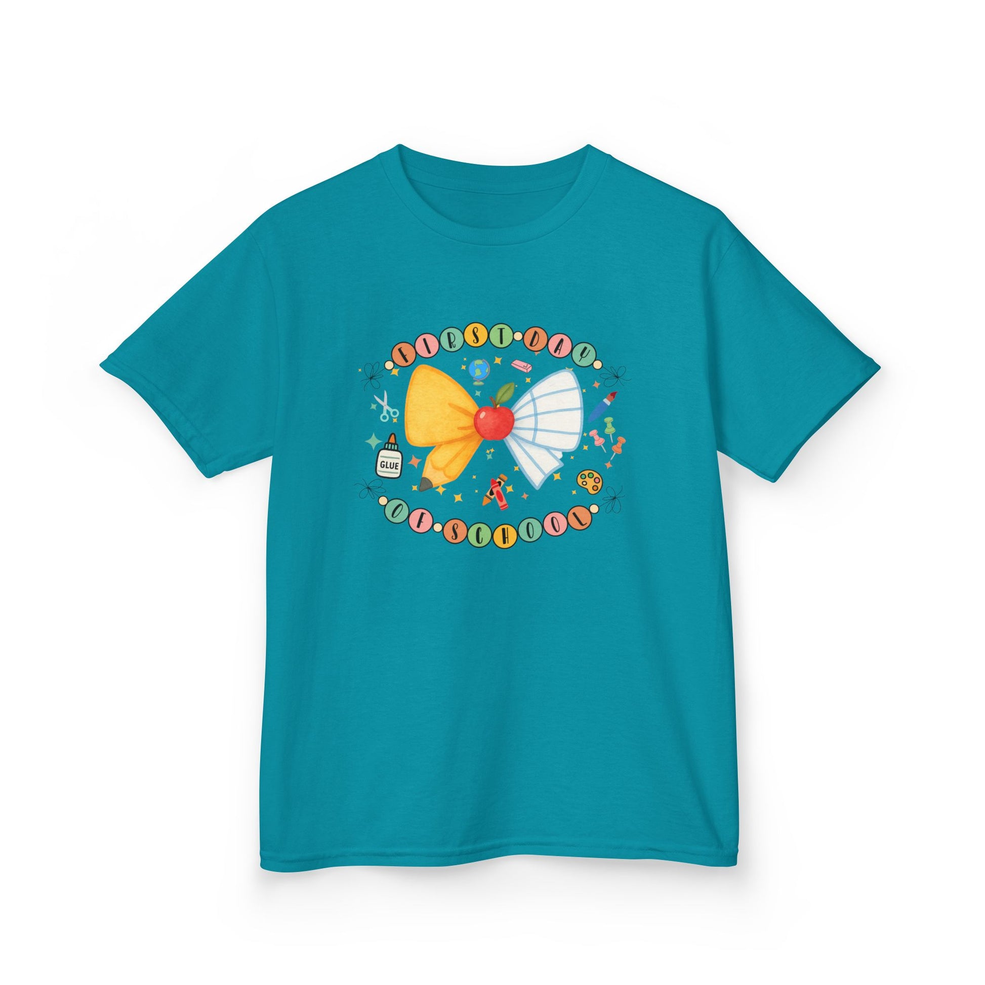 Kick off the school year with this adorable “First Day of School” t-shirt! This playful design features a bright yellow pencil-shaped bow with a red apple center, surrounded by colorful school supplies and a hand-drawn friendship bracelet that spells out “First Day of School.”