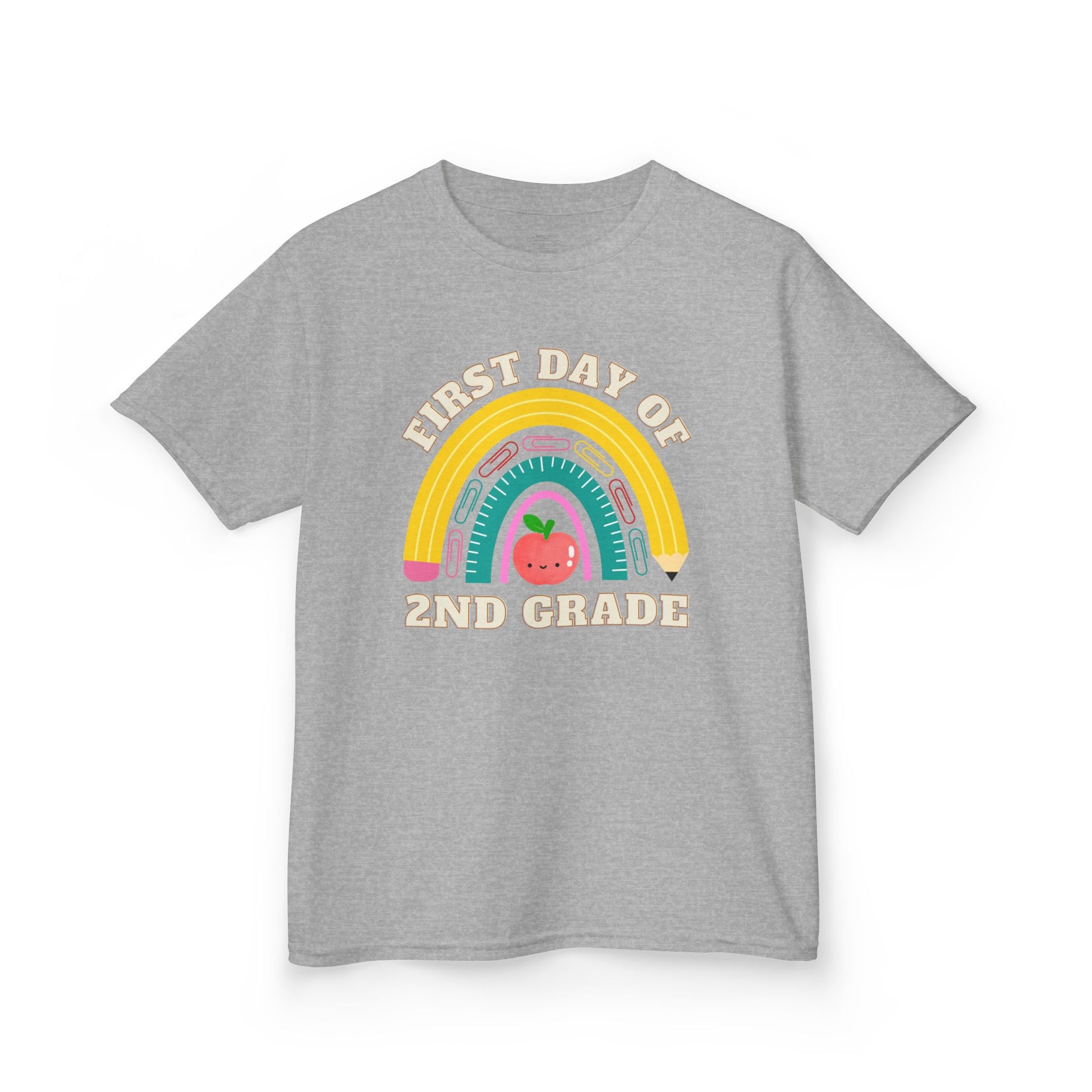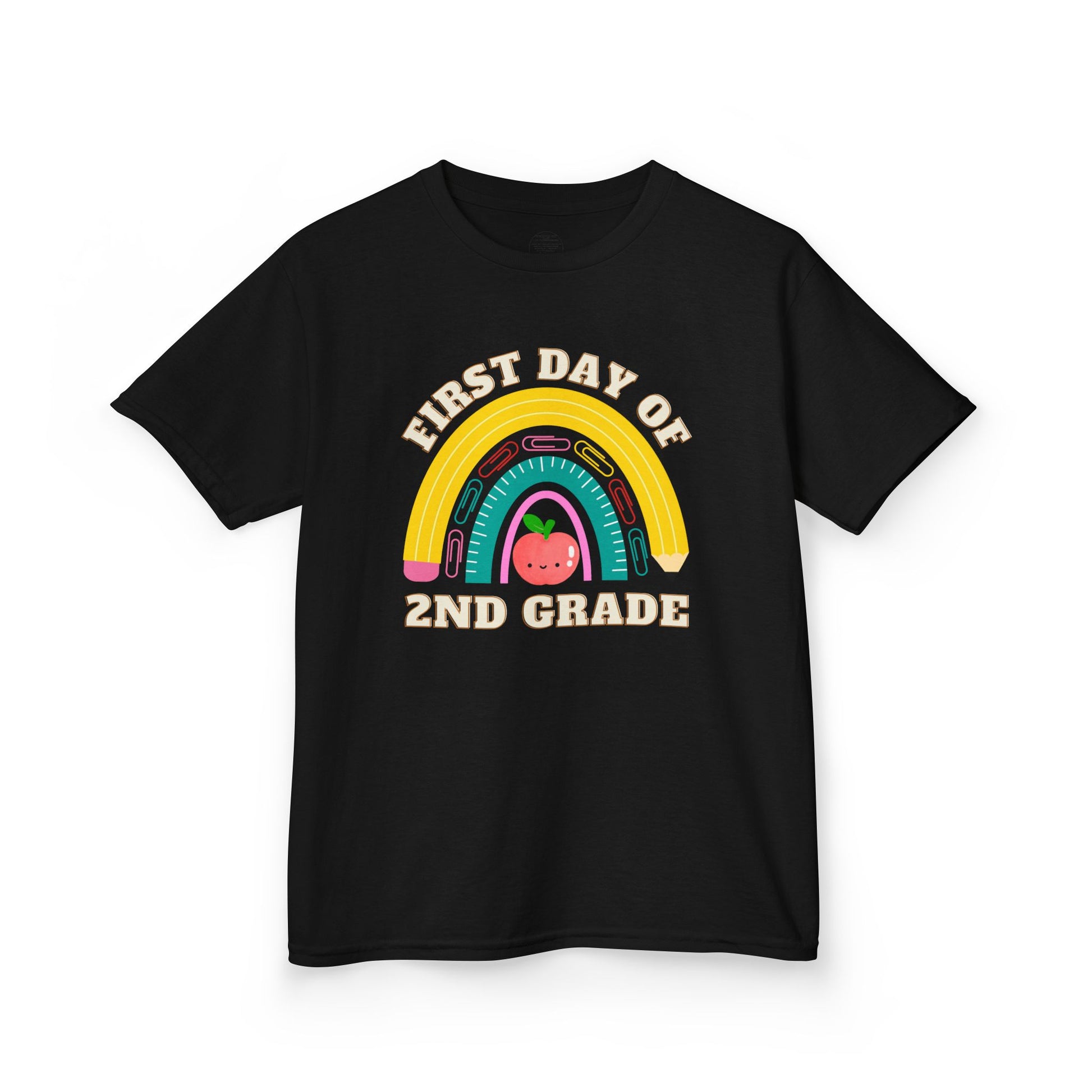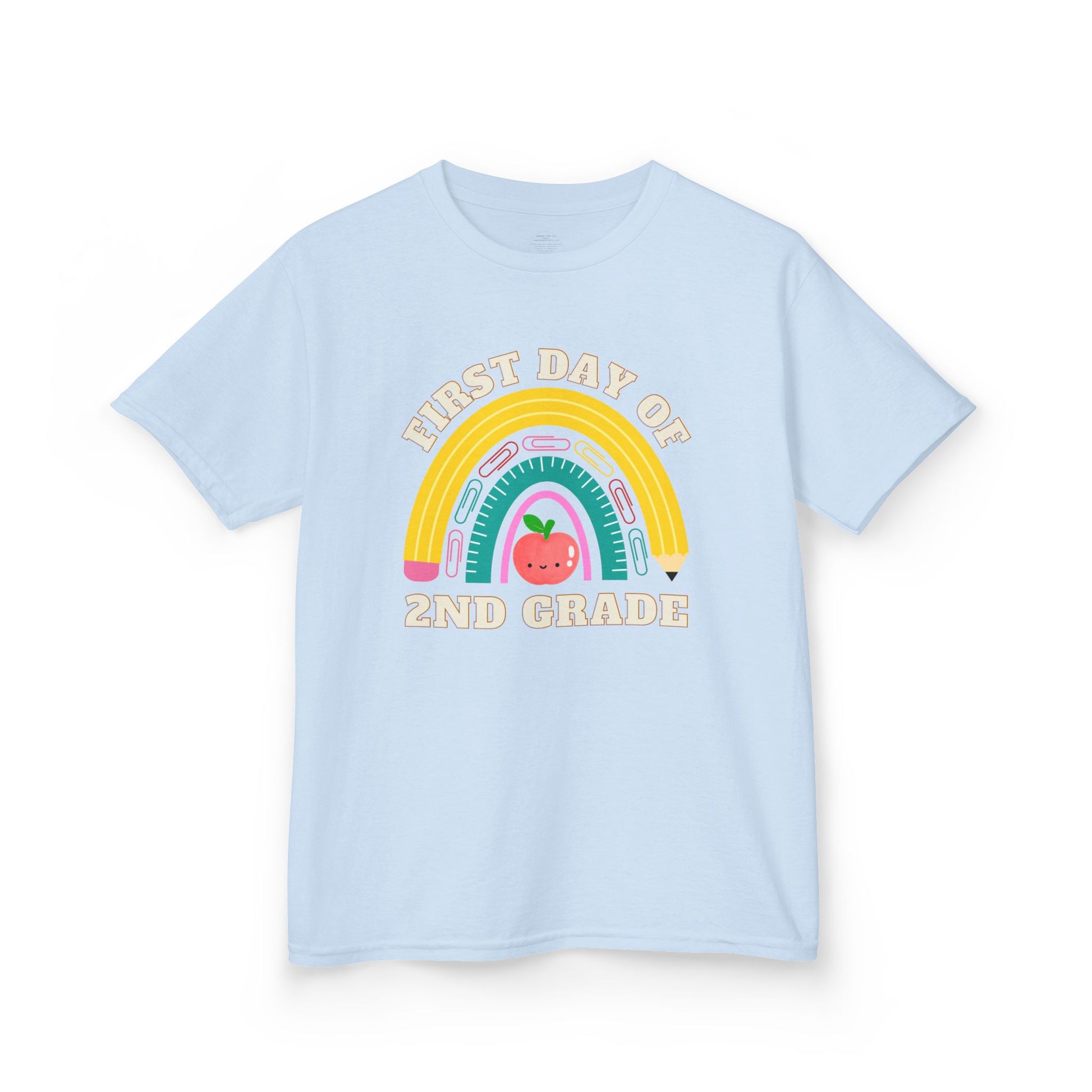 Celebrate the first day of school in style with this adorable personalized t-shirt for kids! Featuring a hand-drawn rainbow made of school supplies and a cute smiling apple, this design is a perfect keepsake for your child’s big day. Customize it with any grade from Kindergarten through 6th!