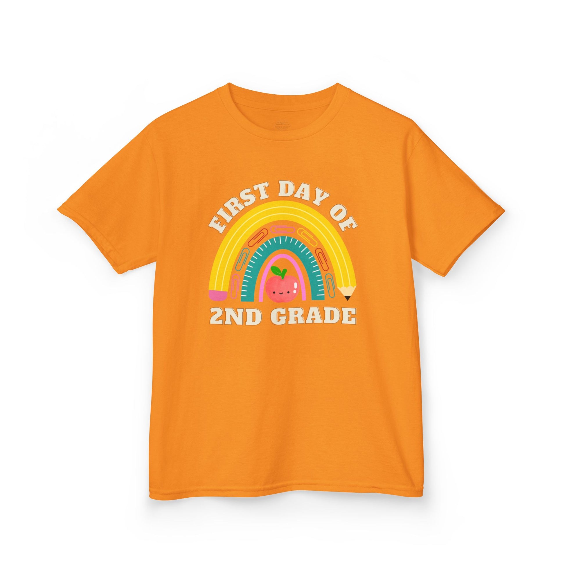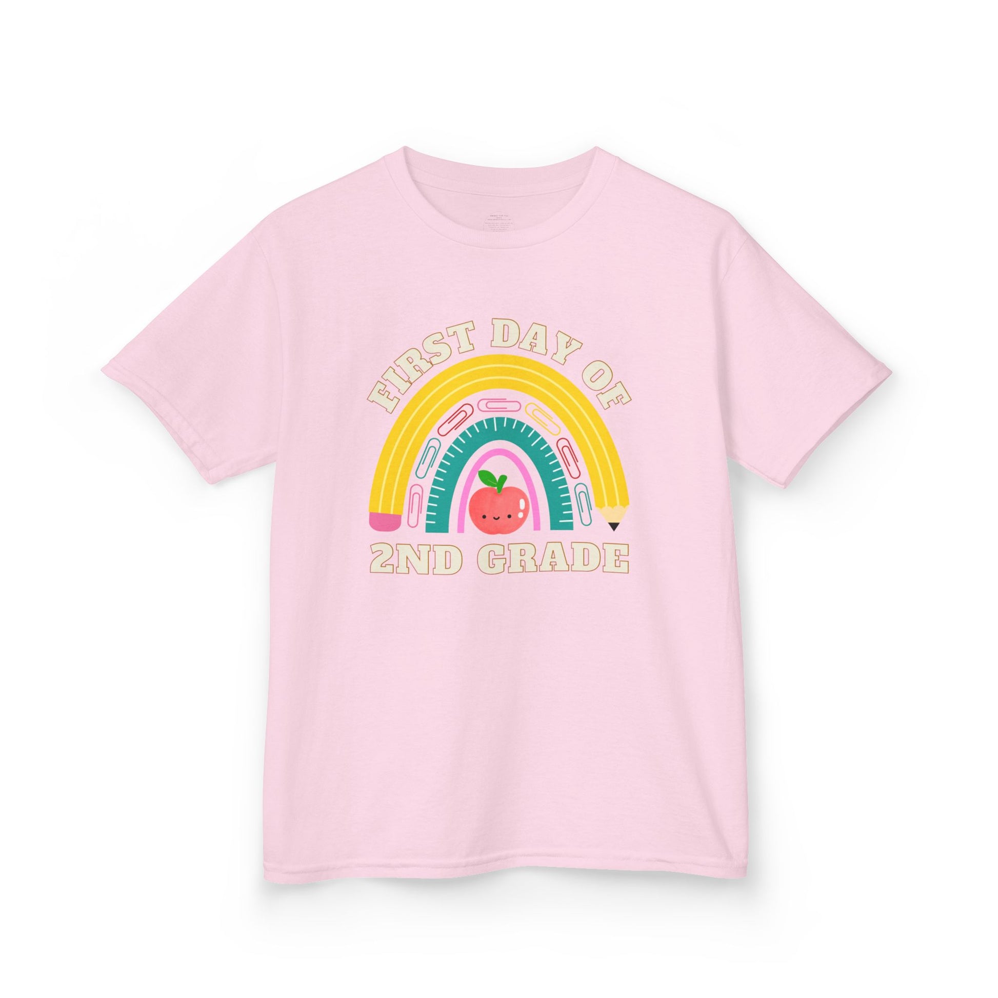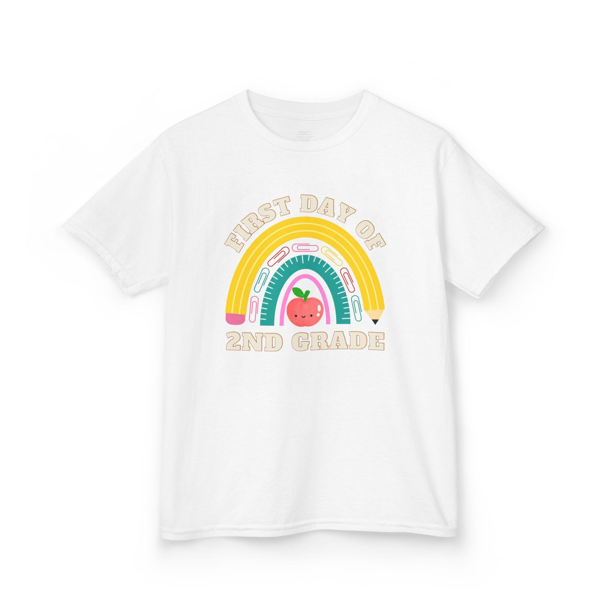 Celebrate the first day of school in style with this adorable personalized t-shirt for kids! Featuring a hand-drawn rainbow made of school supplies and a cute smiling apple, this design is a perfect keepsake for your child’s big day. Customize it with any grade from Kindergarten through 6th!
