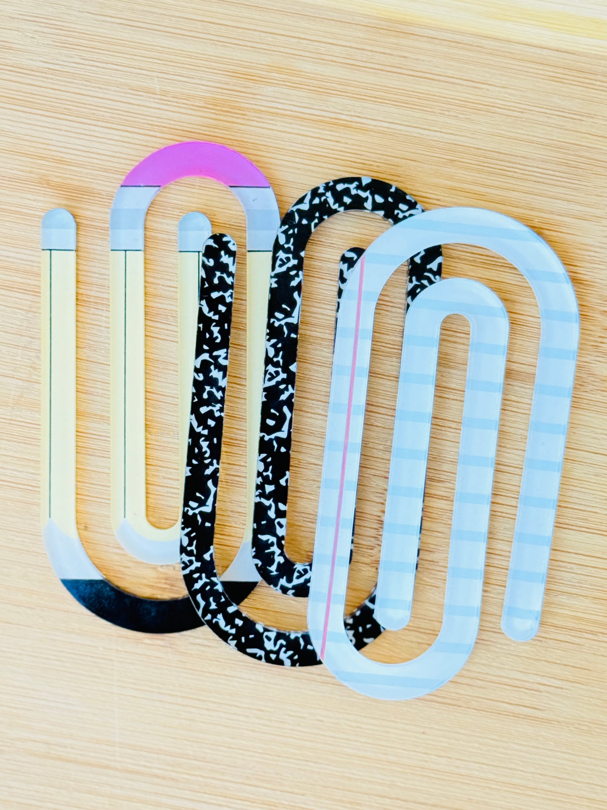 Acrylic Jumbo Paper Clip Bookmarks- Pencil, Composition Book & Ruled Paper Designs
